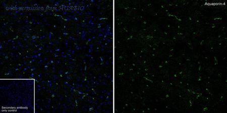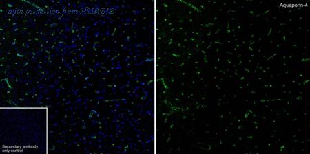 Immunohistochemical analysis of paraffin-embedded human brain tissue with Rat anti-Aquaporin 4 antibody (HA601462) at 1/1,000 dilution. The section was pre-treated using heat mediated antigen retrieval with Tris-EDTA buffer (pH 9.0) for 20 minutes. The tissues were blocked in 1% BSA for 20 minutes at room temperature, washed with ddH2O and PBS, and then probed with the primary antibody (HA601462) at 1/1,000 dilution for 1 hour at room temperature. The detection was performed using an HRP conjugated compact polymer system. DAB was used as the chromogen. Tissues were counterstained with hematoxylin and mounted with DPX.