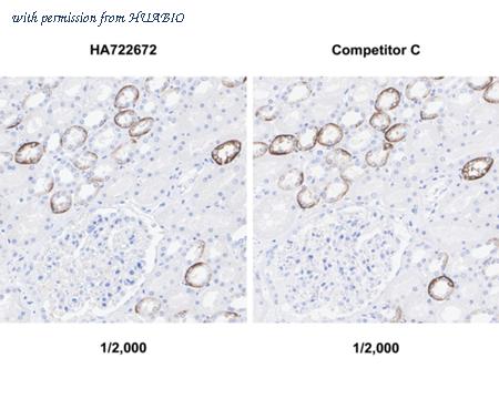 Immunohistochemical analysis of paraffin-embedded human kidney tissue with Rabbit anti-Aquaporin 4 antibody (HA751077) at 1/2,000 dilution and competitor's antibody at 1/2,000 dilution. The section was pre-treated using heat mediated antigen retrieval with Tris-EDTA buffer (pH 9.0) for 20 minutes. The tissues were blocked in 1% BSA for 20 minutes at room temperature, washed with ddH2O and PBS, and then probed with the primary antibody (HA751077) at 1/2,000 dilution and competitor's antibody at 1/2,000 dilution for 1 hour at room temperature. The detection was performed using an HRP conjugated compact polymer system. DAB was used as the chromogen. Tissues were counterstained with hematoxylin and mounted with DPX.