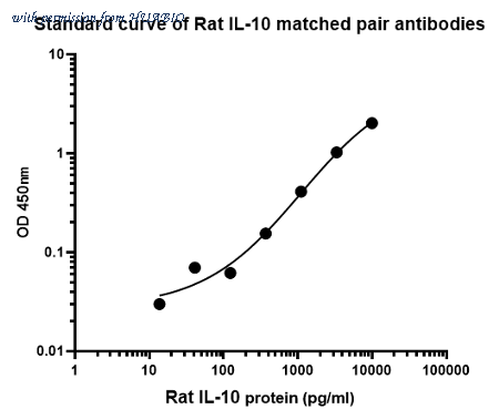 Sandwich ELISA analysis of Rat IL-10 matched pair antibodies. Elisa assay was performed by coating wells of a 96-well plate with 100 µl per well of capture antibody (HA721786) diluted in carbonate/bicarbonate buffer, at a concentration of 2 µg/ml overnight at 4℃. Wells of the plate were washed, blocked with 150 µl 0.05% tween-20 1%BSA blocking buffer, and incubated with serial diluted Rat IL-10 protein starting from 10000 pg/ml to 0 pg/ml and detect antibody [PSH02-22]-Biotin for 1 hour at 30℃ with shaking. Then the plate was washed and incubated with 100 µl per well of SA-HRP for 0.5 hour at 30℃ with shaking. Detection was performed using an Ultra TMB Substrate for 10 minutes at room temperature in the dark. The reaction was stopped with sulfuric acid and absorbances were read on a spectrophotometer at 450 nm.