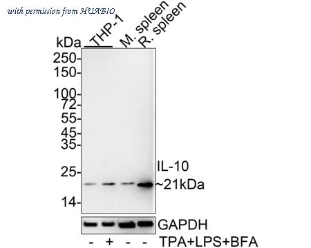 Western blot analysis of IL-10 on different lysates with Rabbit anti-IL-10 antibody (HA722032) at 1/1,000 dilution. Lane 1: THP-1 cell lysate (30 µg/Lane) Lane 2: THP-1 treated with 80nM TPA overnight then treated with 100ng/mL LPS for 6 hours add 300ng/mL BFA for 3 hours cell lysate (30 µg/Lane) Lane 3: Mouse spleen tissue lysate (40 µg/Lane) Lane 4: Rat spleen tissue lysate (40 µg/Lane) Predicted band size: 21 kDa Observed band size: 21 kDa Exposure time: 1 minutes 59 seconds; 4-20% SDS-PAGE gel. Proteins were transferred to a PVDF membrane and blocked with 5% NFDM/TBST for 1 hour at room temperature. The primary antibody (HA722032) at 1/1,000 dilution was used in 5% NFDM/TBST at 4℃ overnight. Goat Anti-Rabbit IgG - HRP Secondary Antibody (HA1001) at 1/50,000 dilution was used for 1 hour at room temperature.