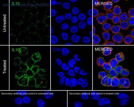 Immunocytochemistry analysis of THP-1 cells treated with 80nM TPA overnight then treated with 100ng/mL LPS for 6 hours add 300ng/mL BFA for 3 hours labeling IL-10 with Rabbit anti-IL-10 antibody (HA722032) at 1/500 dilution. Cells were fixed in 4% paraformaldehyde for 20 minutes at room temperature, permeabilized with 0.1% Triton X-100 in PBS for 5 minutes at room temperature, then blocked with 1% BSA in 10% negative goat serum for 1 hour at room temperature. Cells were then incubated with Rabbit anti-IL-10 antibody (HA722032) at 1/500 dilution in 1% BSA in PBST overnight at 4 ℃. Goat Anti-Rabbit IgG H&L (iFluor™ 488, HA1121) was used as the secondary antibody at 1/1,000 dilution. PBS instead of the primary antibody was used as the secondary antibody only control. Nuclear DNA was labelled in blue with DAPI. Beta tubulin (M1305-2, red) was stained at 1/100 dilution overnight at +4℃. Goat Anti-Mouse IgG H&L (iFluor™ 594, HA1126) was used as the secondary antibody at 1/1,000 dilution.