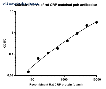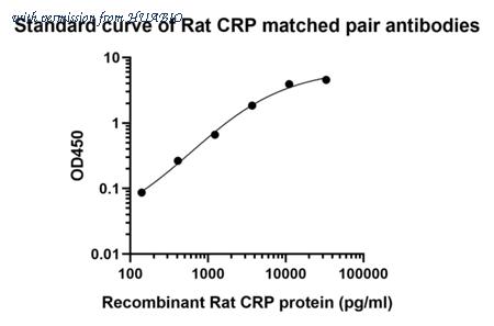 Sandwich ELISA analysis of Rat CRP matched pair antibodies Capture: HA725049, Rat CRP Rabbit mAb [PSH12-79] Detector: HA725050, Rat CRP Rabbit mAb [PSH12-80] Elisa assay was performed by coating wells of a 96-well plate with 50 µl per well of capture antibody (HA725049) diluted in carbonate/bicarbonate buffer, at a concentration of 2 µg/ml overnight at 4℃. Wells of the plate were washed, blocked with 150 µl 0.05% tween-20 1% BSA blocking buffer, and incubated with serial diluted Recombinant Rat CRP protein (HA211008) starting from 10,000 pg/ml to 0 pg/ml and detect antibody (HA725050, Biotin, 0.2 µg/ml) for 1 hour at 30℃ with shaking. Then the plate was washed and incubated with 50 µl per well of SA-HRP for 0.5 hour at 30℃ with shaking. Detection was performed using an Ultra TMB Substrate for 10 minutes at room temperature in the dark. The reaction was stopped with sulfuric acid and absorbances were read on a spectrophotometer at 450 nm.