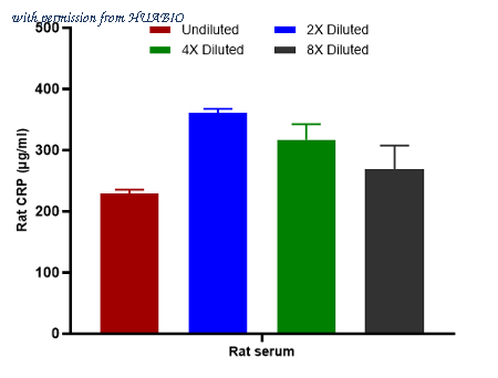Interpolated concentrations of native CRP in rat serum samples. Capture: HA725049, Rat CRP Rabbit mAb [PSH12-79] Detector: HA725050, Rat CRP Rabbit mAb [PSH12-80] The concentrations of CRP were measured in duplicates, interpolated from the CRP standard curve and corrected for sample dilution. Undiluted samples are rat serum 0.0031%. The interpolated dilution factor corrected values are plotted (mean +/- SD, n=2). The mean CRP concentration was determined to be 294 µg/ml in rat serum.