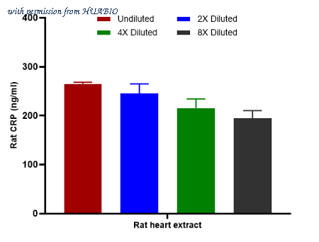 Interpolated concentrations of native CRP in rat heart extract samples based on a 1,000 µg/ml extract load. Capture: HA725049, Rat CRP Rabbit mAb [PSH12-79] Detector: HA725050, Rat CRP Rabbit mAb [PSH12-80] The concentrations of CRP were measured in duplicates, interpolated from the CRP standard curve and corrected for sample dilution. Undiluted samples are rat heart extract 2.5%. The interpolated dilution factor corrected values are plotted (mean +/- SD, n=2). The mean CRP concentration was determined to be 230 ng/ml in rat heart extract.