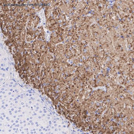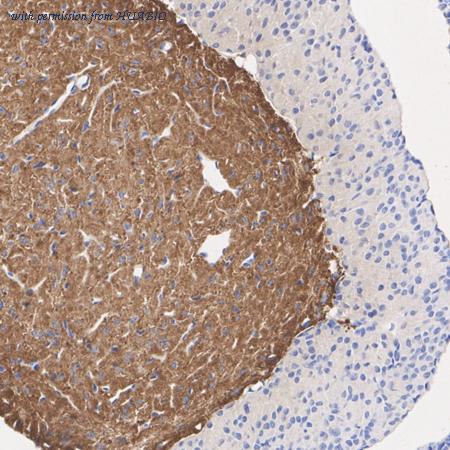 Immunohistochemical analysis of paraffin-embedded mouse pituitary tissue with Rabbit anti-Oxytocin-neurophysin 1 / OXT antibody (ER64173) at 1/8,000 dilution. The section was pre-treated using heat mediated antigen retrieval with Tris-EDTA buffer (pH 9.0) for 20 minutes. The tissues were blocked in 1% BSA for 20 minutes at room temperature, washed with ddH2O and PBS, and then probed with the primary antibody (ER64173) at 1/8,000 dilution for 1 hour at room temperature. The detection was performed using an HRP conjugated compact polymer system. DAB was used as the chromogen. Tissues were counterstained with hematoxylin and mounted with DPX.