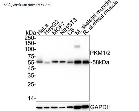 Western blot analysis of PKM2 on different lysates with Rabbit anti-PKM2 antibody (R1603-5) at 1/2,000 dilution. Lane 1: HeLa cell lysate (20 µg/Lane) Lane 2: MCF7 cell lysate (20 µg/Lane) Lane 3: A549 cell lysate (20 µg/Lane) Lane 4: NIH/3T3 cell lysate (20 µg/Lane) Lane 5: C6 cell lysate (20 µg/Lane) Lane 6: Mouse skeletal muscle tissue lysate (negative) (40 µg/Lane) Predicted band size: 58 kDa Observed band size: 58 kDa Exposure time: 13 seconds; ECL: K1801; 4-20% SDS-PAGE gel. Proteins were transferred to a PVDF membrane and blocked with 5% NFDM/TBST for 1 hour at room temperature. The primary antibody (R1603-5) at 1/2,000 dilution was used in 5% NFDM/TBST at 4℃ overnight. Goat Anti-Rabbit IgG - HRP Secondary Antibody (HA1001) at 1/50,000 dilution was used for 1 hour at room temperature.