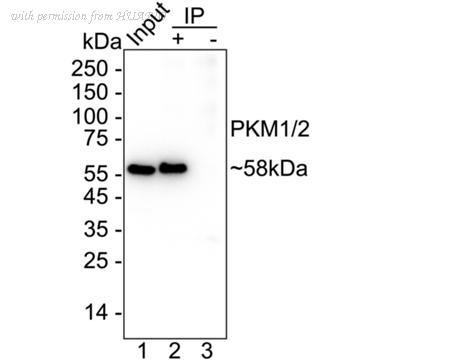 PKM1/2 was immunoprecipitated from 0.2 mg HeLa cell lysate with HA722524 at 2 µg/10 µl beads. Western blot was performed from the immunoprecipitate using HA722524 at 1/1,000 dilution. Anti-Rabbit IgG for IP Nano-secondary antibody (NBI01H) at 1/5,000 dilution was used for 1 hour at room temperature. Lane 1: HeLa cell lysate (input) Lane 2: HA722524 IP in HeLa cell lysate Lane 3: Rabbit IgG instead of HA722524 in HeLa cell lysate Blocking/Dilution buffer: 5% NFDM/TBST Exposure time: 2 seconds; ECL: K1801