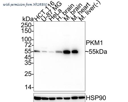 Western blot analysis of PKM1 on different lysates with Rabbit anti-PKM1 antibody (HA722120) at 1/1,000 dilution. Lane 1: HCT 116 cell lysate (20 µg/Lane) Lane 2: U-87 MG cell lysate (20 µg/Lane) Lane 3: HeLa cell lysate (20 µg/Lane) Lane 4: Human brain tissue lysate (40 µg/Lane) Lane 5: Mouse brain tissue lysate (40 µg/Lane) Lane 6: Mouse heart tissue lysate (40 µg/Lane) Lane 7: Mouse liver tissue lysate (negative) (40 µg/Lane) Predicted band size: 58 kDa Observed band size: 55 kDa Exposure time: 14 seconds; ECL: K1801; 4-20% SDS-PAGE gel. Proteins were transferred to a PVDF membrane and blocked with 5% NFDM/TBST for 1 hour at room temperature. The primary antibody (HA722120) at 1/1,000 dilution was used in 5% NFDM/TBST at 4℃ overnight. Goat Anti-Rabbit IgG - HRP Secondary Antibody (HA1001) at 1/50,000 dilution was used for 1 hour at room temperature.