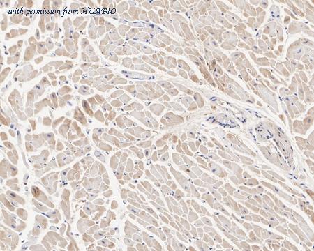 Immunohistochemical analysis of paraffin-embedded human heart tissue with Rabbit anti-PKM1 antibody (HA750946) at 1/30,000 dilution. The section was pre-treated using heat mediated antigen retrieval with Tris-EDTA buffer (pH 9.0) for 20 minutes. The tissues were blocked in 1% BSA for 20 minutes at room temperature, washed with ddH2O and PBS, and then probed with the primary antibody (HA750946) at 1/30,000 dilution for 1 hour at room temperature. The detection was performed using an HRP conjugated compact polymer system. DAB was used as the chromogen. Tissues were counterstained with hematoxylin and mounted with DPX.