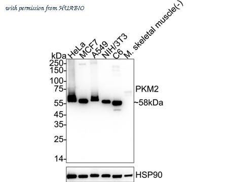 Western blot analysis of PKM2 on different lysates with Rabbit anti-PKM2 antibody (HA751429) at 1/10,000 dilution. Lane 1: HeLa cell lysate (15 µg/Lane) Lane 2: MCF7 cell lysate (15 µg/Lane) Lane 3: A549 cell lysate (15 µg/Lane) Lane 4: NIH/3T3 cell lysate (15 µg/Lane) Lane 5: C6 cell lysate (15 µg/Lane) Lane 6: Mouse skeletal muscle tissue lysate (negative) (20 µg/Lane) Lane 7: COS-1 cell lysate (15 µg/Lane) Predicted band size: 58 kDa Observed band size: 58 kDa Exposure time: 10 seconds; ECL: K1801; 4-20% SDS-PAGE gel. Proteins were transferred to a PVDF membrane and blocked with 5% NFDM/TBST for 1 hour at room temperature. The primary antibody (HA751429) at 1/10,000 dilution was used in 5% NFDM/TBST at 4℃ overnight. Goat Anti-Rabbit IgG - HRP Secondary Antibody (HA1001) at 1/50,000 dilution was used for 1 hour at room temperature.