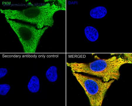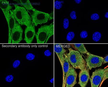 Immunocytochemistry analysis of HeLa cells labeling PKM2 with Rabbit anti-PKM2 antibody (R1603-5) at 1/200 dilution. Cells were fixed in 4% paraformaldehyde for 15 minutes at room temperature, permeabilized with 0.1% Triton X-100 in PBS for 15 minutes at room temperature, then blocked with 1% BSA in 10% negative goat serum for 1 hour at room temperature. Cells were then incubated with Rabbit anti-PKM2 antibody (R1603-5) at 1/200 dilution in 1% BSA in PBST overnight at 4 ℃. Goat Anti-Rabbit IgG H&L (iFluor™ 488, HA1121) was used as the secondary antibody at 1/1,000 dilution. PBS instead of the primary antibody was used as the secondary antibody only control. Nuclear DNA was labelled in blue with DAPI. Beta tubulin (HA601187, red) was stained at 1/100 dilution overnight at +4℃. Goat Anti-Mouse IgG H&L (iFluor™ 594, HA1126) was used as the secondary antibody at 1/1,000 dilution.