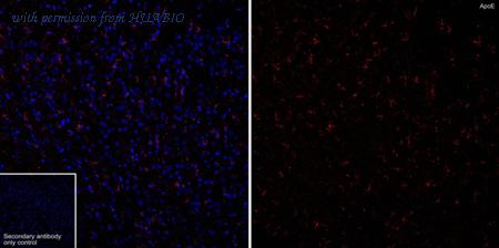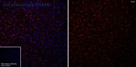 Immunofluorescence analysis of frozen mouse brain tissue with Rabbit anti-Apolipoprotein E antibody (HA723216) at 1/500 dilution. The section was not undergone antigen retrieval. The tissues were blocked in 10% negative goat serum for 1 hour at room temperature, washed with PBS, and then probed with the primary antibody (HA723216, red) at 1/500 dilution overnight at 4 ℃, washed with PBS. Goat Anti-Rabbit IgG H&L (iFluor™ 594, HA1122) was used as the secondary antibody at 1/1,000 dilution. Nuclei were counterstained with DAPI (blue).
