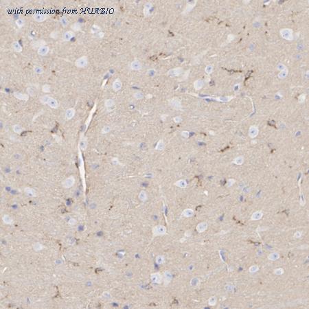 Immunohistochemical analysis of paraffin-embedded mouse brain tissue with Rat anti-Apolipoprotein E antibody (HA601391) at 1/2,000 dilution. The section was pre-treated using heat mediated antigen retrieval with Tris-EDTA buffer (pH 9.0) for 20 minutes. The tissues were blocked in 1% BSA for 20 minutes at room temperature, washed with ddH2O and PBS, and then probed with the primary antibody (HA601391) at 1/2,000 dilution for 1 hour at room temperature. The detection was performed using an HRP conjugated compact polymer system. DAB was used as the chromogen. Tissues were counterstained with hematoxylin and mounted with DPX.