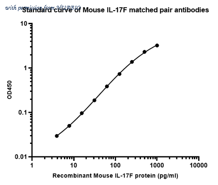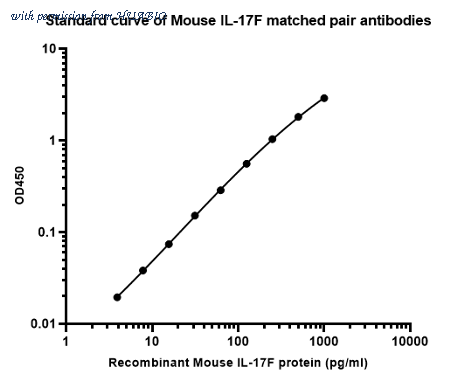 Elisa assay was performed by coating wells of a 96-well plate with 100 µl per well of capture antibody (HA723901) diluted in carbonate/bicarbonate buffer, at a concentration of 2 µg/mL overnight at 4℃. Wells of the plate were washed, blocked with 150 µl 0.05% tween-20 1% BSA blocking buffer, and incubated with serial diluted Recombinant Mouse IL-17F protein (HA211035) starting from 1,000 pg/ml to 0 pg/ml and detect antibody (HA723902, Biotin, 0.2 µg/ml) for 1 hour at 30℃ with shaking. Then the plate was washed and incubated with 100 µl per well of SA-HRP for 0.5 hour at 30℃ with shaking. Detection was performed using an Ultra TMB Substrate for 10 minutes at room temperature in the dark. The reaction was stopped with sulfuric acid and absorbances were read on a spectrophotometer at 450 nm.