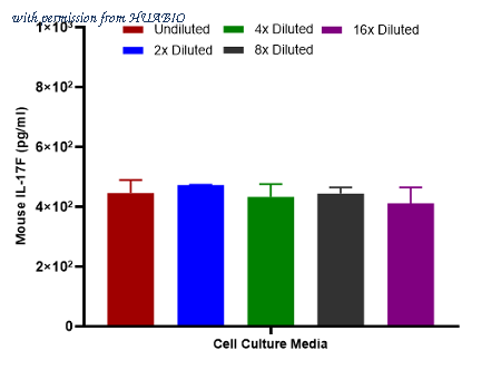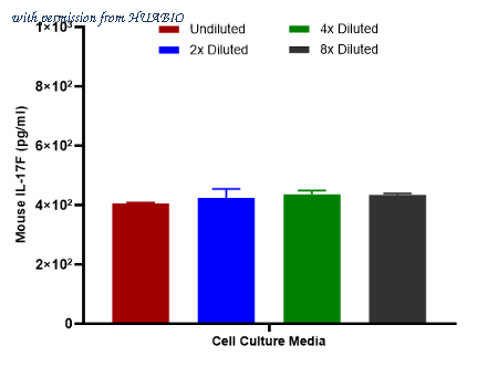The concentrations of IL-17F were measured in duplicates, interpolated from the IL-17F standard curves and corrected for sample dilution. diluted samples are as follows: 50% cell culture media with FBS. The interpolated dilution factor corrected values are plotted (mean +/- SD, n=2).