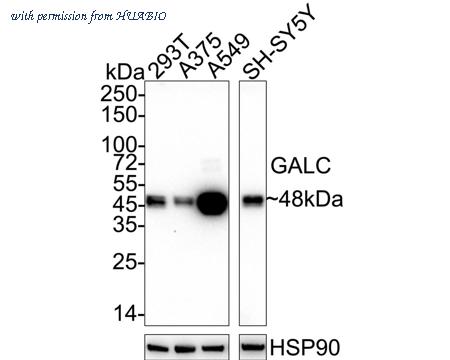 Western blot analysis of GALC on different lysates with Rabbit anti-GALC antibody (HA722115) at 1/2,000 dilution. Lane 1: 293T cell lysate (20 µg/Lane) Lane 2: A375 cell lysate (20 µg/Lane) Lane 3: A549 cell lysate (20 µg/Lane) Lane 4: SH-SY5Y cell lysate (20 µg/Lane) Predicted band size: 77 kDa Observed band size: 48 kDa Exposure time: 3 minutes; ECL: K1801; 4-20% SDS-PAGE gel. Proteins were transferred to a PVDF membrane and blocked with 5% NFDM/TBST for 1 hour at room temperature. The primary antibody (HA722115) at 1/2,000 dilution was used in 5% NFDM/TBST at 4℃ overnight. Goat Anti-Rabbit IgG - HRP Secondary Antibody (HA1001) at 1/50,000 dilution was used for 1 hour at room temperature.