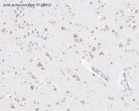 Immunohistochemical analysis of paraffin-embedded human brain tissue with Rabbit anti-GALC antibody (HA750941) at 1/200 dilution. The section was pre-treated using heat mediated antigen retrieval with Tris-EDTA buffer (pH 9.0) for 20 minutes. The tissues were blocked in 1% BSA for 20 minutes at room temperature, washed with ddH2O and PBS, and then probed with the primary antibody (HA750941) at 1/200 dilution for 1 hour at room temperature. The detection was performed using an HRP conjugated compact polymer system. DAB was used as the chromogen. Tissues were counterstained with hematoxylin and mounted with DPX.