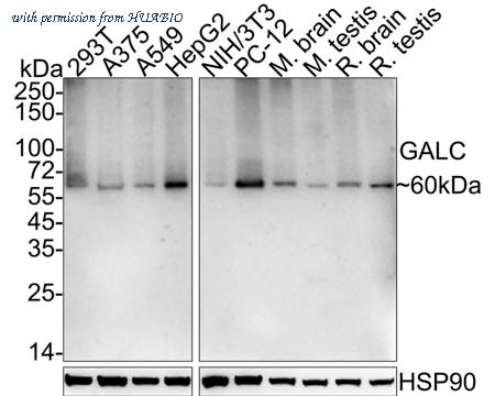 Western blot analysis of GALC on different lysates with Rabbit anti-GALC antibody (HA722004) at 1/5,000 dilution. Lane 1: 293T cell lysate Lane 2: A375 cell lysate Lane 3: A549 cell lysate Lane 4: HepG2 cell lysate Lane 5: NIH/3T3 cell lysate Lane 6: PC-12 cell lysate Lane 7: Mouse brain tissue lysate Lane 8: Mouse testis tissue lysate Lane 9: Rat brain tissue lysate Lane 10: Rat testis tissue lysate Lysates/proteins at 20 µg/Lane. Predicted band size: 77 kDa Observed band size: 60 kDa Exposure time: 43 seconds; 4-20% SDS-PAGE gel. Proteins were transferred to a PVDF membrane and blocked with 5% NFDM/TBST for 1 hour at room temperature. The primary antibody (HA722004) at 1/5,000 dilution was used in 5% NFDM/TBST at 4℃ overnight. Goat Anti-Rabbit IgG - HRP Secondary Antibody (HA1001) at 1/50,000 dilution was used for 1 hour at room temperature.