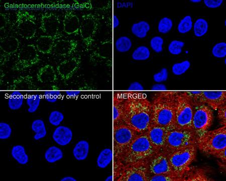 Immunocytochemistry analysis of A549 cells labeling GALC with Rabbit anti-GALC antibody (HA750879) at 1/100 dilution. Cells were fixed in 4% paraformaldehyde for 20 minutes at room temperature, permeabilized with 0.1% Triton X-100 in PBS for 5 minutes at room temperature, then blocked with 1% BSA in 10% negative goat serum for 1 hour at room temperature. Cells were then incubated with Rabbit anti-GALC antibody (HA750879) at 1/100 dilution in 1% BSA in PBST overnight at 4 ℃. Goat Anti-Rabbit IgG H&L (iFluor™ 488, HA1121) was used as the secondary antibody at 1/1,000 dilution. PBS instead of the primary antibody was used as the secondary antibody only control. Nuclear DNA was labelled in blue with DAPI. Beta tubulin (M1305-2, red) was stained at 1/100 dilution overnight at +4℃. Goat Anti-Mouse IgG H&L (iFluor™ 594, HA1126) was used as the secondary antibody at 1/1,000 dilution.