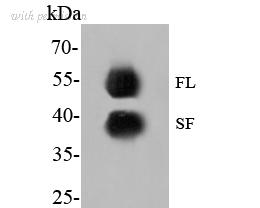 Western blot analysis of GATA3 on MCF-7 cell lysate. Proteins were transferred to a PVDF membrane and blocked with 5% BSA in PBS for 1 hour at room temperature. The primary antibody (ER1901-20, 1/500) was used in 5% BSA at room temperature for 2 hours. Goat Anti-Rabbit IgG - HRP Secondary Antibody (HA1001) at 1:5,000 dilution was used for 1 hour at room temperature. Specific bands were detected for GATA3 full length (FL) at approximately 52 kDa and the splice form (SF) at approximately 39 kDa (as indicated).