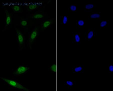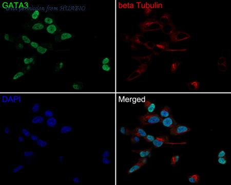 Immunocytochemistry analysis of MCF-7 cells labeling GATA3 with Mouse anti-GATA3 antibody (EM1902-33) at 1/50 dilution. Cells were fixed in 4% paraformaldehyde for 30 minutes, permeabilized with 0.05% Triton X-100 in PBS for 20 minutes, and then blocked with 2% negative goat serum for 30 minutes at room temperature. Cells were then incubated with Mouse anti-GATA3 antibody (EM1902-33) at 1/50 dilution in 2% negative goat serum overnight at 4 ℃. Goat Anti-Mouse IgG H&L (iFluor™ 488, HA1125) was used as the secondary antibody at 1/1,000 dilution. Nuclear DNA was labelled in blue with DAPI. beta Tubulin (ET1602-4, red) was stained at 1/100 dilution overnight at +4℃. Goat Anti-Rabbit IgG H&L (iFluor™ 594, HA1122) were used as the secondary antibody at 1/1,000 dilution.