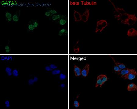 Immunocytochemistry analysis of SH-SY5Y cells labeling GATA3 with Mouse anti-GATA3 antibody (EM1902-33) at 1/50 dilution. Cells were fixed in 4% paraformaldehyde for 30 minutes, permeabilized with 0.05% Triton X-100 in PBS for 20 minutes, and then blocked with 2% negative goat serum for 30 minutes at room temperature. Cells were then incubated with Mouse anti-GATA3 antibody (EM1902-33) at 1/50 dilution in 2% negative goat serum overnight at 4 ℃. Goat Anti-Mouse IgG H&L (iFluor™ 488, HA1125) was used as the secondary antibody at 1/1,000 dilution. Nuclear DNA was labelled in blue with DAPI. beta Tubulin (ET1602-4, red) was stained at 1/100 dilution overnight at +4℃. Goat Anti-Rabbit IgG H&L (iFluor™ 594, HA1122) were used as the secondary antibody at 1/1,000 dilution.