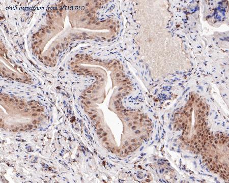 Immunohistochemical analysis of paraffin-embedded human breast tissue with Mouse anti-GATA3 antibody (HA601132) at 1/1,000 dilution. The section was pre-treated using heat mediated antigen retrieval with sodium citrate buffer (pH 6.0) (high pressure) for 2 minutes. The tissues were blocked in 1% BSA for 20 minutes at room temperature, washed with ddH2O and PBS, and then probed with the primary antibody (HA601132) at 1/1,000 dilution for 1 hour at room temperature. The detection was performed using an HRP conjugated compact polymer system. DAB was used as the chromogen. Tissues were counterstained with hematoxylin and mounted with DPX.