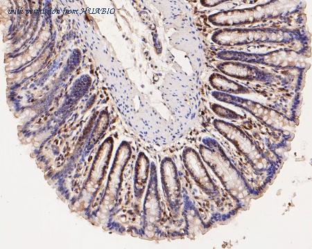 Immunohistochemical analysis of paraffin-embedded rat large intestine tissue using anti-GATA3 antibody. The section was pre-treated using heat mediated antigen retrieval with Tris-EDTA buffer (pH 8.0-8.4) for 20 minutes.The tissues were blocked in 5% BSA for 30 minutes at room temperature, washed with ddH2O and PBS, and then probed with the primary antibody (ER1902-69, 1/50) for 30 minutes at room temperature. The detection was performed using an HRP conjugated compact polymer system. DAB was used as the chromogen. Tissues were counterstained with hematoxylin and mounted with DPX.