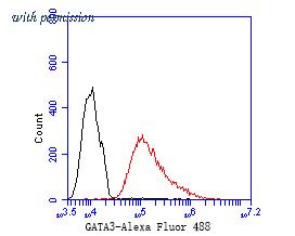 Flow cytometric analysis of GATA3 was done on MCF-7 cells. The cells were fixed, permeabilized and stained with the primary antibody (ER1902-69, 1/50) (red). After incubation of the primary antibody at room temperature for an hour, the cells were stained with a Alexa Fluor 488-conjugated Goat anti-Rabbit IgG Secondary antibody at 1/1000 dilution for 30 minutes.Unlabelled sample was used as a control (cells without incubation with primary antibody; black).