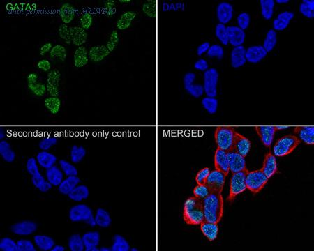 ICC staining of GATA3 in MCF-7 cells (green). Formalin fixed cells were permeabilized with 0.1% Triton X-100 in TBS for 10 minutes at room temperature and blocked with 1% Blocker BSA for 15 minutes at room temperature. Cells were probed with the primary antibody (ER1901-20, 1/50) for 1 hour at room temperature, washed with PBS. Alexa Fluor®488 Goat anti-Rabbit IgG was used as the secondary antibody at 1/1,000 dilution. The nuclear counter stain is DAPI (blue).