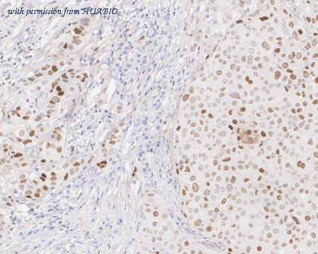 Immunohistochemical analysis of paraffin-embedded human breast carcinoma tissue with Mouse anti-GATA3 antibody (HA601132) at 1/1,000 dilution. The section was pre-treated using heat mediated antigen retrieval with sodium citrate buffer (pH 6.0) (high pressure) for 2 minutes. The tissues were blocked in 1% BSA for 20 minutes at room temperature, washed with ddH2O and PBS, and then probed with the primary antibody (HA601132) at 1/1,000 dilution for 1 hour at room temperature. The detection was performed using an HRP conjugated compact polymer system. DAB was used as the chromogen. Tissues were counterstained with hematoxylin and mounted with DPX.