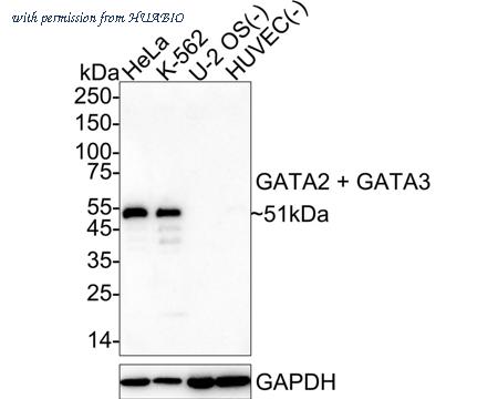 Western blot analysis of GATA2 + GATA3 on different lysates with Rabbit anti-GATA2 + GATA3 antibody (HA722713) at 1/1,000 dilution. Lane 1: HeLa cell lysate Lane 2: K-562 cell lysate Lane 3: U-2 OS cell lysate (negative) Lane 4: HUVEC cell lysate (negative) Lysates/proteins at 20 µg/Lane. Predicted band size: 51 kDa Observed band size: 51 kDa Exposure time: 3 minutes; ECL: K1801; 4-20% SDS-PAGE gel. Proteins were transferred to a PVDF membrane and blocked with 5% NFDM/TBST for 1 hour at room temperature. The primary antibody (HA722713) at 1/1,000 dilution was used in 5% NFDM/TBST at 4℃ overnight. Goat Anti-Rabbit IgG - HRP Secondary Antibody (HA1001) at 1/50,000 dilution was used for 1 hour at room temperature.