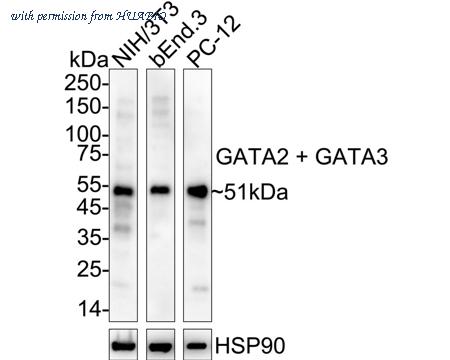 Western blot analysis of GATA2 + GATA3 on different lysates with Rabbit anti-GATA2 + GATA3 antibody (HA722713) at 1/1,000 dilution. Lane 1: NIH/3T3 cell lysate Lane 2: bEND.3 cell lysate Lane 3: PC-12 cell lysate Lysates/proteins at 20 µg/Lane. Predicted band size: 51 kDa Observed band size: 51 kDa Exposure time: 1 minute 2 seconds; ECL: K1802; 4-20% SDS-PAGE gel. Proteins were transferred to a PVDF membrane and blocked with 5% NFDM/TBST for 1 hour at room temperature. The primary antibody (HA722713) at 1/1,000 dilution was used in 5% NFDM/TBST at 4℃ overnight. Goat Anti-Rabbit IgG - HRP Secondary Antibody (HA1001) at 1/50,000 dilution was used for 1 hour at room temperature.