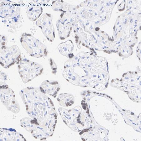 Immunohistochemical analysis of paraffin-embedded human placenta tissue with Rabbit anti-GATA2 + GATA3 antibody (HA722713) at 1/200 dilution. The section was pre-treated using heat mediated antigen retrieval with sodium citrate buffer (pH 6.0) (high pressure) for 2 minutes. The tissues were blocked in 1% BSA for 20 minutes at room temperature, washed with ddH2O and PBS, and then probed with the primary antibody (HA722713) at 1/200 dilution for 1 hour at room temperature. The detection was performed using an HRP conjugated compact polymer system. DAB was used as the chromogen. Tissues were counterstained with hematoxylin and mounted with DPX.
