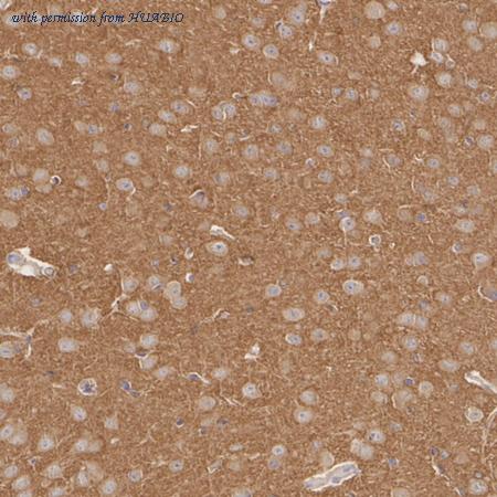 Immunohistochemical analysis of paraffin-embedded rat cerebrum tissue with Mouse anti-Homer1 antibody (HA610300) at 1/1,000 dilution. The section was pre-treated using heat mediated antigen retrieval with Tris-EDTA buffer (pH 9.0) for 20 minutes. The tissues were blocked in 1% BSA for 20 minutes at room temperature, washed with ddH2O and PBS, and then probed with the primary antibody (HA610300) at 1/1,000 dilution for 1 hour at room temperature. The detection was performed using an HRP conjugated compact polymer system. DAB was used as the chromogen. Tissues were counterstained with hematoxylin and mounted with DPX.