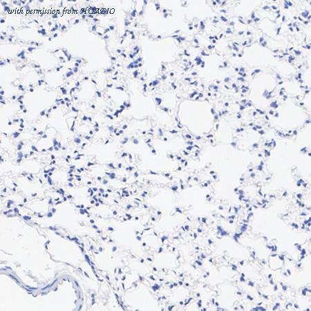 Immunohistochemical analysis of paraffin-embedded mouse lung tissue (negative) with Rat anti-Homer1 antibody (HA610255) at 1/1,000 dilution. The section was pre-treated using heat mediated antigen retrieval with Tris-EDTA buffer (pH 9.0) for 20 minutes. The tissues were blocked in 1% BSA for 20 minutes at room temperature, washed with ddH2O and PBS, and then probed with the primary antibody (HA610255) at 1/1,000 dilution for 1 hour at room temperature. The detection was performed using an HRP conjugated compact polymer system. DAB was used as the chromogen. Tissues were counterstained with hematoxylin and mounted with DPX.