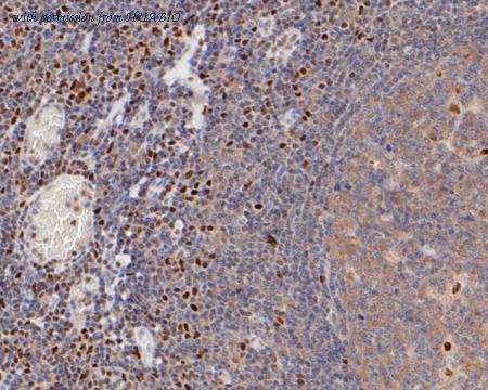 Immunohistochemical analysis of paraffin-embedded human lymph nodes tissue with Rabbit anti-FOXP1 antibody (HA721195) at 1/5,000 dilution. The section was pre-treated using heat mediated antigen retrieval with sodium citrate buffer (pH 6.0) (high pressure) for 2 minutes. The tissues were blocked in 1% BSA for 20 minutes at room temperature, washed with ddH2O and PBS, and then probed with the primary antibody (HA721195) at 1/5,000 dilution for 1 hour at room temperature. The detection was performed using an HRP conjugated compact polymer system. DAB was used as the chromogen. Tissues were counterstained with hematoxylin and mounted with DPX.
