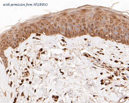 Immunohistochemical analysis of paraffin-embedded human skin tissue using anti-FoxP1 antibody. The section was pre-treated using heat mediated antigen retrieval with sodium citrate buffer (pH 6.0) (high pressure) for 2 minutes. The tissues were blocked in 5% BSA for 30 minutes at room temperature, washed with ddH2O and PBS, and then probed with the primary antibody (ER1901-25, 1/50) for 30 minutes at room temperature. The detection was performed using an HRP conjugated compact polymer system. DAB was used as the chromogen. Tissues were counterstained with hematoxylin and mounted with DPX.