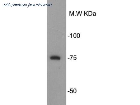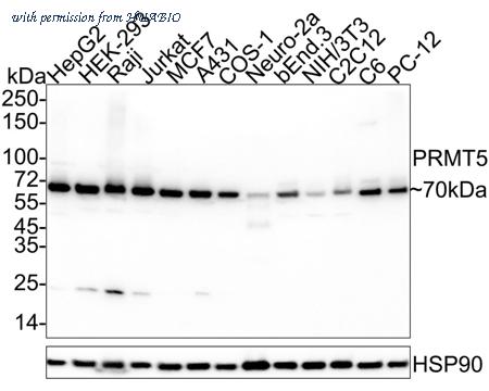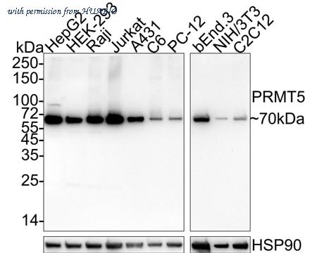 Western blot analysis of PRMT5 on different lysates with Rabbit anti-PRMT5 antibody (HA750174) at 1/5,000 dilution. Lane 1: HepG2 cell lysate Lane 2: HEK-293 cell lysate Lane 3: Raji cell lysate Lane 4: Jurkat cell lysate Lane 5: A431 cell lysate Lane 6: C6 cell lysate Lane 7: PC-12 cell lysate Lane 8: bEnd.3 cell lysate Lane 9: NIH/3T3 cell lysate Lane 10: C2C12 cell lysate Lysates/proteins at 30 µg/Lane. Predicted band size: 73 kDa Observed band size: 70 kDa Exposure time: 1 minute 50 seconds; ECL: K1801; 4-20% SDS-PAGE gel. Proteins were transferred to a PVDF membrane and blocked with 5% NFDM/TBST for 1 hour at room temperature. The primary antibody (HA750174) at 1/5,000 dilution was used in 5% NFDM/TBST at 4℃ overnight. Goat Anti-Rabbit IgG - HRP Secondary Antibody (HA1001) at 1/50,000 dilution was used for 1 hour at room temperature.