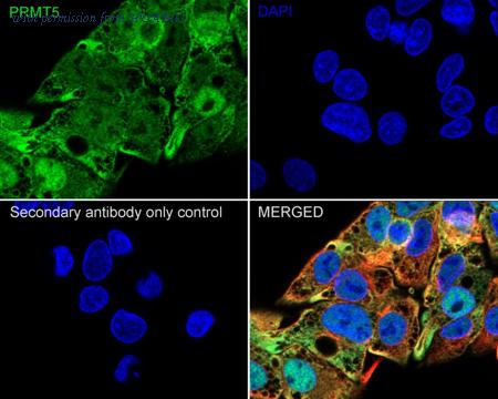 Immunocytochemistry analysis of HepG2 cells labeling PRMT5 with Rabbit anti-PRMT5 antibody (ET1609-43) at 1/250 dilution. Cells were fixed in 4% paraformaldehyde for 20 minutes at room temperature, permeabilized with 0.1% Triton X-100 in PBS for 5 minutes at room temperature, then blocked with 1% BSA in 10% negative goat serum for 1 hour at room temperature. Cells were then incubated with Rabbit anti-PRMT5 antibody (ET1609-43) at 1/250 dilution in 1% BSA in PBST overnight at 4 ℃. Goat Anti-Rabbit IgG H&L (iFluor™ 488, HA1121) was used as the secondary antibody at 1/1,000 dilution. PBS instead of the primary antibody was used as the secondary antibody only control. Nuclear DNA was labelled in blue with DAPI. Beta tubulin (M1305-2, red) was stained at 1/100 dilution overnight at +4℃. Goat Anti-Mouse IgG H&L (iFluor™ 594, HA1126) was used as the secondary antibody at 1/1,000 dilution.