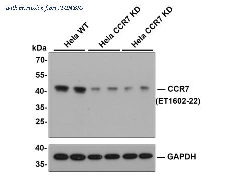 All lanes: Western blot analysis of CCR7 with anti-CCR7 antibody (ET1602-22) at 1:5,000 dilution. Lane 1/2: Wild-type Hela whole cell lysate (10 µg). Lane 3/4: CCR7 fragment 1 knockdown Hela whole cell lysate (10 µg). Lane 5/6: CCR7 fragment 2 knockdown Hela whole cell lysate (10 µg). ET1602-22 was shown to specifically react with CCR7 in wild-type Hela cells. Weakened was observed when CCR7 knockdown sample was tested. Wild-type and CCR7 knockdown samples were subjected to SDS-PAGE. Proteins were transferred to a PVDF membrane and blocked with 5% NFDM in TBST for 1 hour at room temperature. The primary antibody (ET1602-22, 1/500) and Loading control antibody (Rabbit anti-GAPDH, ET1601-4, 1/10,000) was used in 5% BSA at room temperature for 2 hours. Goat Anti-Rabbit IgG-HRP Secondary Antibody (HA1001) at 1:200,000 dilution was used for 1 hour at room temperature.