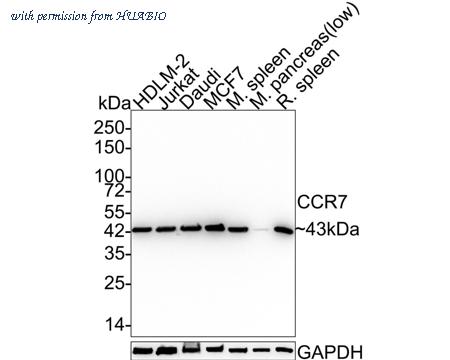 Western blot analysis of CCR7 on different lysates with Rabbit anti-CCR7 antibody (HA750037) at 1/5,000 dilution. Lane 1: HDLM-2 cell lysate Lane 2: Jurkat cell lysate Lane 3: Daudi cell lysate Lane 4: MCF7 cell lysate Lane 5: Mouse spleen tissue lysate Lane 6: Mouse pancreas tissue lysate (low expression) Lane 7: Rat spleen tissue lysate Lysates/proteins at 20 µg/Lane. Predicted band size: 43 kDa Observed band size: 43 kDa Exposure time: 24 seconds; 4-20% SDS-PAGE gel. Proteins were transferred to a PVDF membrane and blocked with 5% NFDM/TBST for 1 hour at room temperature. The primary antibody (HA750037) at 1/5,000 dilution was used in 5% NFDM/TBST at 4℃ overnight. Goat Anti-Rabbit IgG - HRP Secondary Antibody (HA1001) at 1:50,000 dilution was used for 1 hour at room temperature.