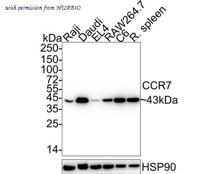 Western blot analysis of CCR7 on different lysates with Rabbit anti-CCR7 antibody (HA750037) at 1/2,000 dilution. Lane 1: Raji cell lysate Lane 2: Daudi cell lysate Lane 3: EL4 cell lysate Lane 4: RAW264.7 cell lysate Lane 5: C6 cell lysate Lane 6: Rat spleen tissue lysate Lysates/proteins at 15 µg/Lane. Predicted band size: 43 kDa Observed band size: 43 kDa Exposure time: 10 seconds; ECL: K1801; 4-20% SDS-PAGE gel. Proteins were transferred to a PVDF membrane and blocked with 5% NFDM/TBST for 1 hour at room temperature. The primary antibody (HA750037) at 1/2,000 dilution was used in 5% NFDM/TBST at 4℃ overnight. Goat Anti-Rabbit IgG - HRP Secondary Antibody (HA1001) at 1:50,000 dilution was used for 1 hour at room temperature.
