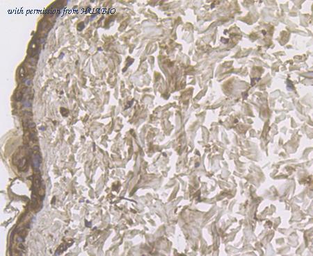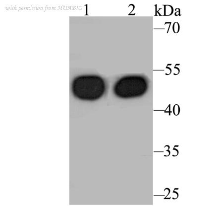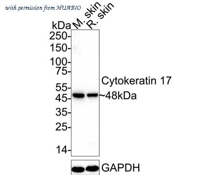 Western blot analysis of Cytokeratin 17 on different lysates with Rabbit anti-Cytokeratin 17 antibody (HA750031) at 1/1,000 dilution. Lane 1: Mouse skin tissue lysate Lane 2: Rat skin tissue lysate Lysates/proteins at 40 µg/Lane. Predicted band size: 48 kDa Observed band size: 48 kDa Exposure time: 3 minutes; ECL: K1801; 4-20% SDS-PAGE gel. Proteins were transferred to a PVDF membrane and blocked with 5% NFDM/TBST for 1 hour at room temperature. The primary antibody (HA750031) at 1/1,000 dilution was used in 5% NFDM/TBST at 4℃ overnight. Goat Anti-Rabbit IgG - HRP Secondary Antibody (HA1001) at 1/50,000 dilution was used for 1 hour at room temperature.
