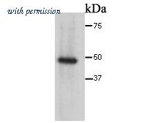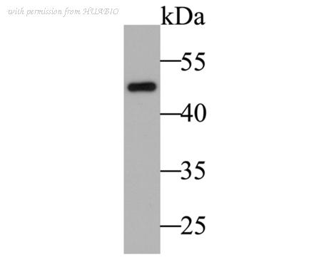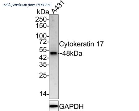 Western blot analysis of Cytokeratin 17 on A431 cell lysates with Rabbit anti-Cytokeratin 17 antibody (HA750031) at 1/2,000 dilution. Lysates/proteins at 15 µg/Lane. Predicted band size: 48 kDa Observed band size: 48 kDa Exposure time: 3 minutes; 4-20% SDS-PAGE gel. Proteins were transferred to a PVDF membrane and blocked with 5% NFDM/TBST for 1 hour at room temperature. The primary antibody (HA750031) at 1/2,000 dilution was used in 5% NFDM/TBST at 4℃ overnight. Goat Anti-Rabbit IgG - HRP Secondary Antibody (HA1001) at 1/50,000 dilution was used for 1 hour at room temperature.
