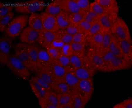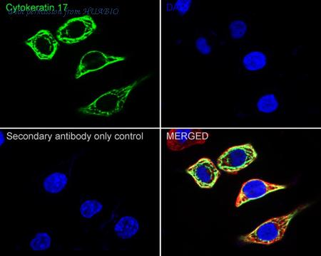 ICC staining Cytokeratin 17 in A431 cells (red). Formalin fixed cells were permeabilized with 0.1% Triton X-100 in TBS for 10 minutes at room temperature and blocked with 1% Blocker BSA for 15 minutes at room temperature. Cells were probed with the antibody (0407-4) at a dilution of 1:100 for 1 hour at room temperature, washed with PBS. Alexa Fluor™594 Goat anti-Rabbit IgG was used as the secondary antibody at 1/100 dilution.