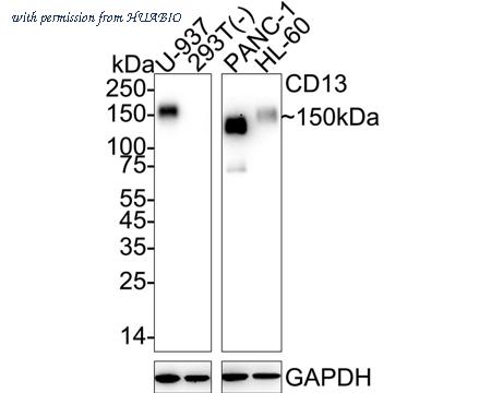 Western blot analysis of CD13 on different lysates with Rabbit anti-CD13 antibody (HA751223) at 1/5,000 dilution. Lane 1: U-937 cell lysate Lane 2: 293T cell lysate (negative) Lane 3: PANC-1 cell lysate Lane 4: HL-60 cell lysate Lysates/proteins at 20 µg/Lane. Predicted band size: 110 kDa Observed band size: 150 kDa Exposure time: Lane 1-2: 3 minutes; Lane 3-4: 20 seconds; ECL: K1801; 4-20% SDS-PAGE gel. Proteins were transferred to a PVDF membrane and blocked with 5% NFDM/TBST for 1 hour at room temperature. The primary antibody (HA751223) at 1/5,000 dilution was used in 5% NFDM/TBST at 4℃ overnight. Goat Anti-Rabbit IgG - HRP Secondary Antibody (HA1001) at 1/50,000 dilution was used for 1 hour at room temperature.