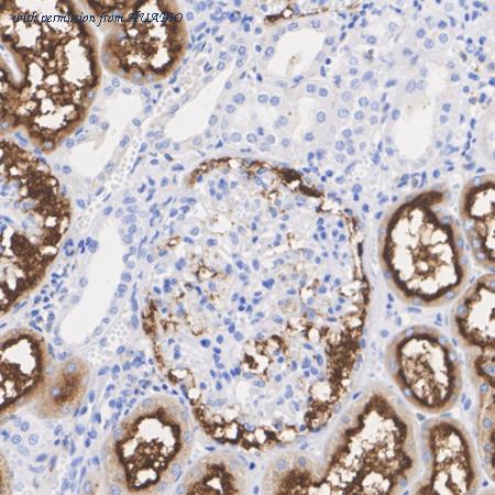 Immunohistochemical analysis of paraffin-embedded human kidney tissue with Rabbit anti-CD13 antibody (HA721160) at 1/20,000 dilution. The section was pre-treated using heat mediated antigen retrieval with Tris-EDTA buffer (pH 9.0) for 20 minutes. The tissues were blocked in 1% BSA for 20 minutes at room temperature, washed with ddH2O and PBS, and then probed with the primary antibody (HA721160) at 1/20,000 dilution for 1 hour at room temperature. The detection was performed using an HRP conjugated compact polymer system. DAB was used as the chromogen. Tissues were counterstained with hematoxylin and mounted with DPX.