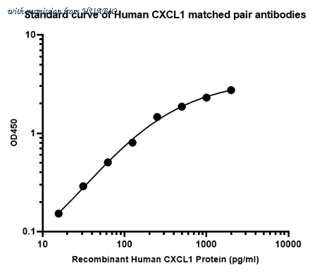 Sandwich ELISA analysis of human CXCL1 matched pair antibodies Elisa assay was performed by coating wells of a 96-well plate with 100 µl per well of capture antibody (HA722493) diluted in carbonate/bicarbonate buffer, at a concentration of 2 µg/ml overnight at 4℃. Wells of the plate were washed, blocked with 150 µl 0.05% tween-20 1%BSA blocking buffer, and incubated with serial diluted Recombinant standard Human CXCL1/GRO alpha protein (HA210838) starting from 2000 pg/ml to 0 pg/ml and detect antibody (HA722494, Biotin, 0.2 µg/ml) for 1 hour at 30℃ with shaking. Then the plate was washed and incubated with 100 µl per well of SA-HRP for 0.5 hour at 30℃ with shaking. Detection was performed using an Ultra TMB Substrate for 10 minutes at room temperature in the dark. The reaction was stopped with sulfuric acid and absorbances were read on a spectrophotometer at 450 nm.