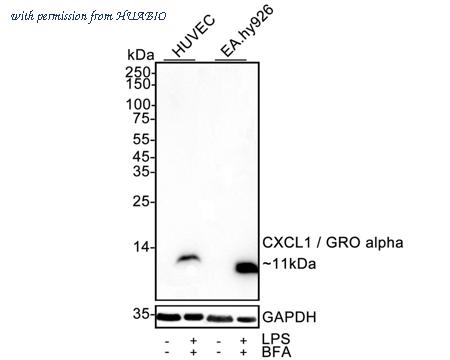 Western blot analysis of CXCL1 / GRO alpha on different lysates with Rabbit anti-CXCL1 / GRO alpha antibody (HA751174) at 1/2,000 dilution. Lane 1: HUVEC cell lysate Lane 2: HUVEC treated with 0.5μg/mL LPS for 24 hours cell lysate, then add 300ng/mL BFA for 20 hours cell lysate Lane 3: EA.hy926 cell lysate Lane 4: EA.hy926 treated with 0.5μg/mL LPS for 4 hours cell lysate, then add 300ng/mL BFA for 20 hours cell lysate Lysates/proteins at 20 µg/Lane. Predicted band size: 11 kDa Observed band size: 11 kDa Exposure time: 3 minutes; ECL: K1801; 4-20% SDS-PAGE gel. Proteins were transferred to a PVDF membrane and blocked with 5% NFDM/TBST for 1 hour at room temperature. The primary antibody (HA722841) at 1/2,000 dilution was used in 5% NFDM/TBST at 4℃ overnight. Goat Anti-Rabbit IgG - HRP Secondary Antibody (HA1001) at 1/50,000 dilution was used for 1 hour at room temperature.